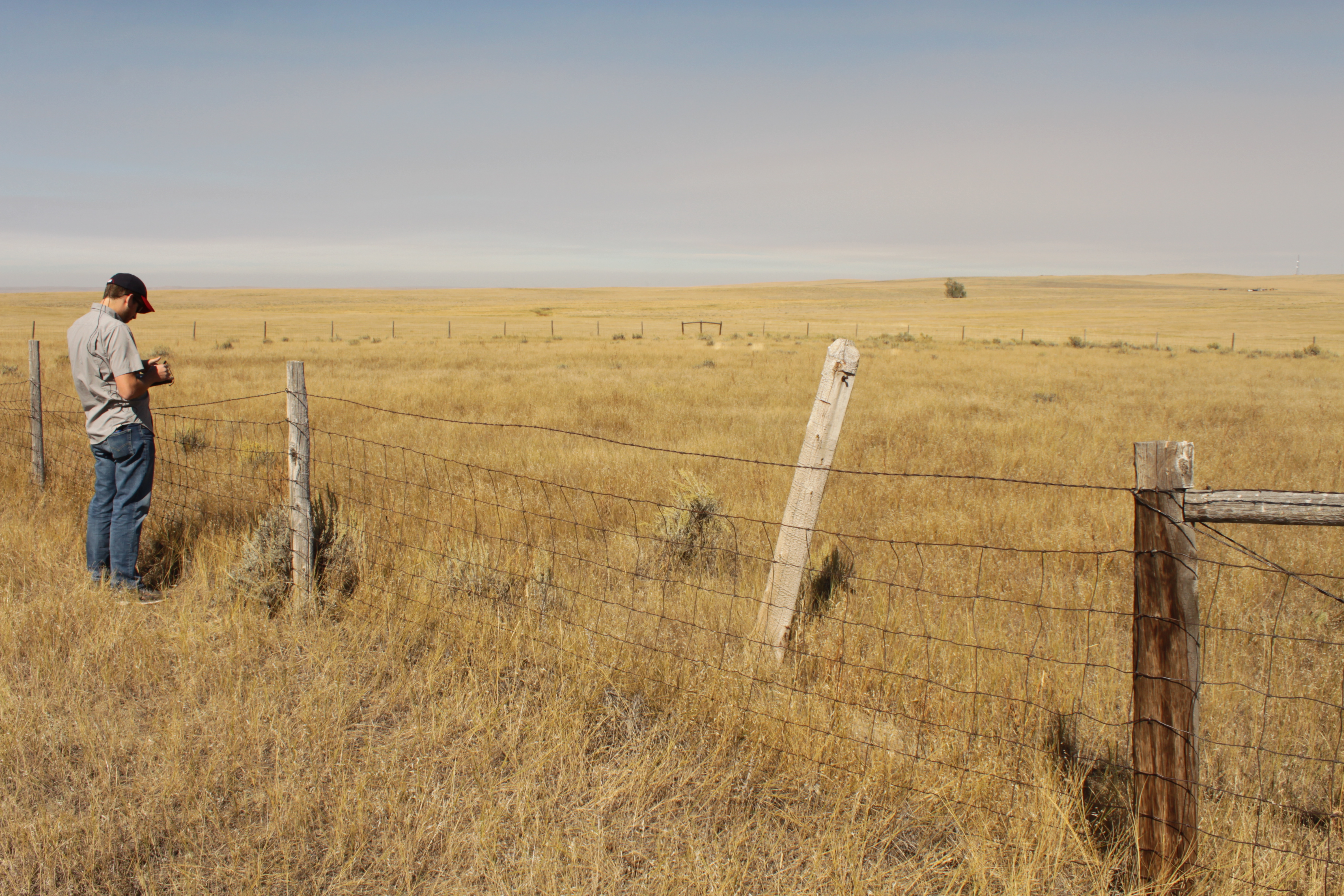 Matthew Rigge takes notes next to a grazing exclosure (with a fence to keep cows out) in eastern Wyoming. The rangeland is heavily invaded with annual grasses. Rigge is the Project Manager for Rangeland Condition Monitoring Assessment and Projection (RCMAP), a project based at the Earth Resources Observation and Science (EROS) Center in Sioux Falls, South Dakota.