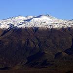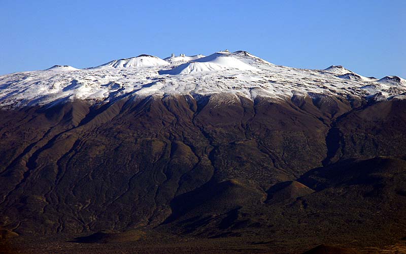 Mauna Kea Volcano, Hawai‘i viewed from the south. Prominent cinder cones seen covered in the summit snow. Astronomical observatories can be seen on the summit.