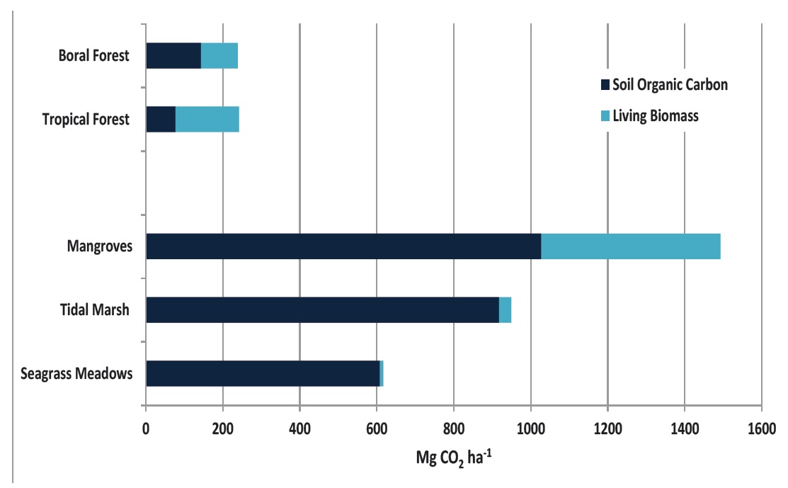 Figure 2. Mean carbon storage above and below ground in coastal ecosystems versus terrestrial forest (Fourqurean et al. 2012; Pan et al. 2011; Pendleton et al. 2012).
