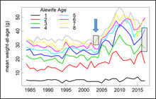 Mean (average) weight-at-age for alewife in Lake Ontario from 1984-2017. Age 3 (green line) and age 4 (blue line) alewife now weigh as much as age 8 (gray line) alewife in the early 2000s (compare lines in gray box on right to line in gray box toward middle of figure). Alewife growth increased coincident with increased prevalence of Cercopagis and Bythotrephes in the early 2000s (blue arrow).