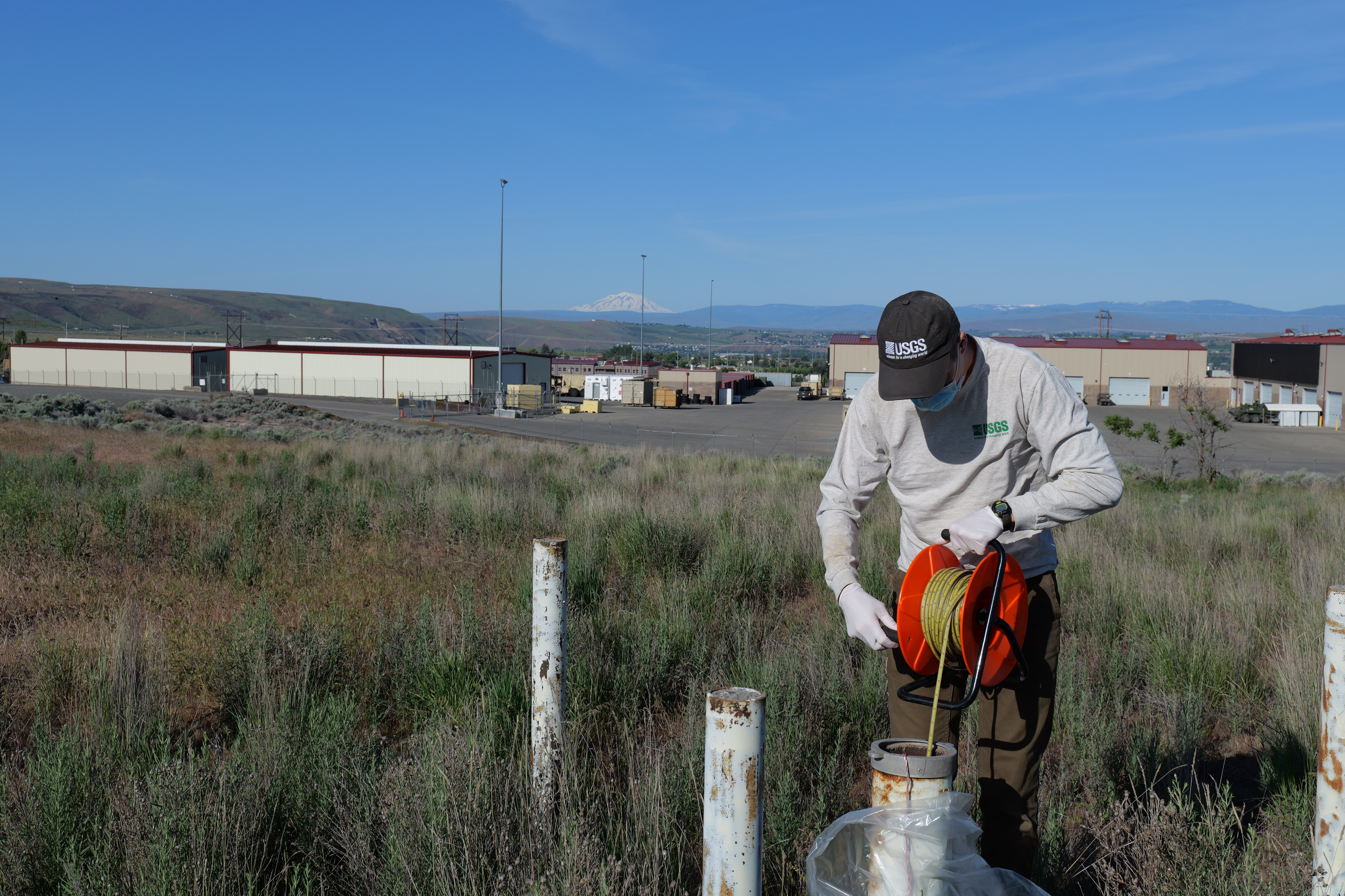 A USGS scientist uses an electronic tape to measure the depth to groundwater in a well in Washington.