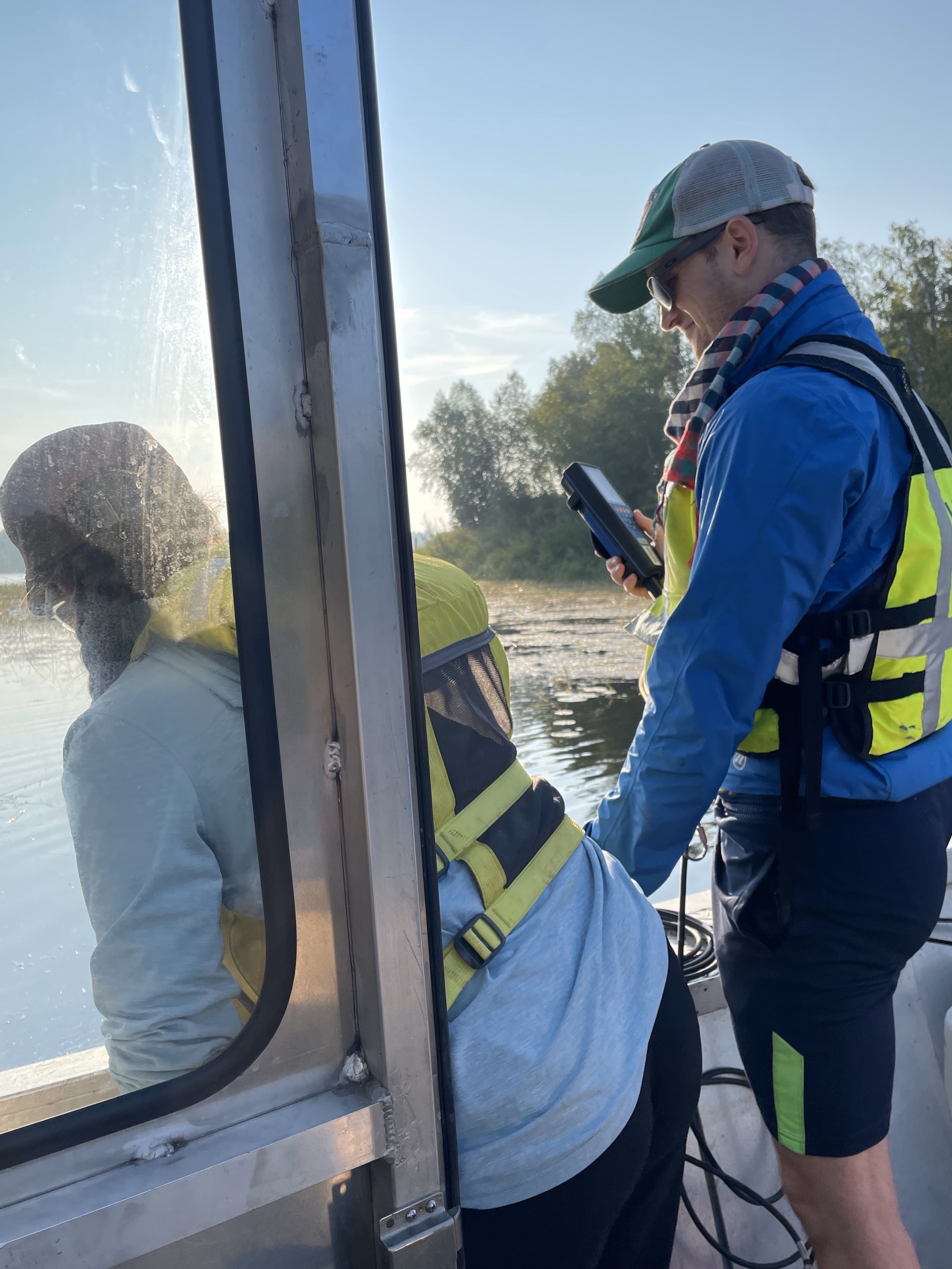 Two USGS scientists measuring water quality along the Rainy River and at its mouth in Four-Mile Bay, Lake of the Woods, Minnesota, to study how phosphorus stored in sediment may be interacting with river water and potentially contributing to problematic algal blooms in Lake of the Woods.