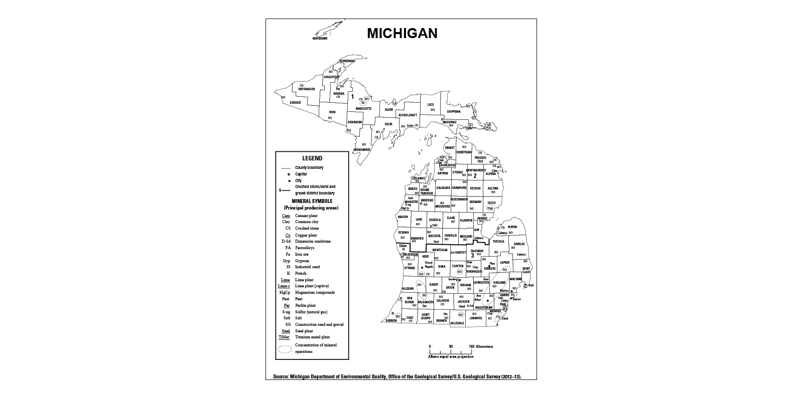 The Michigan chapter of the Minerals Yearbook Volume II - Area Reports, Domestic - contains data and information on the nonfuel mineral commoodities produced in Michigan including a generalized map of principal mineral commodity producing areas. Both PDF and XLS versions of text and data are available