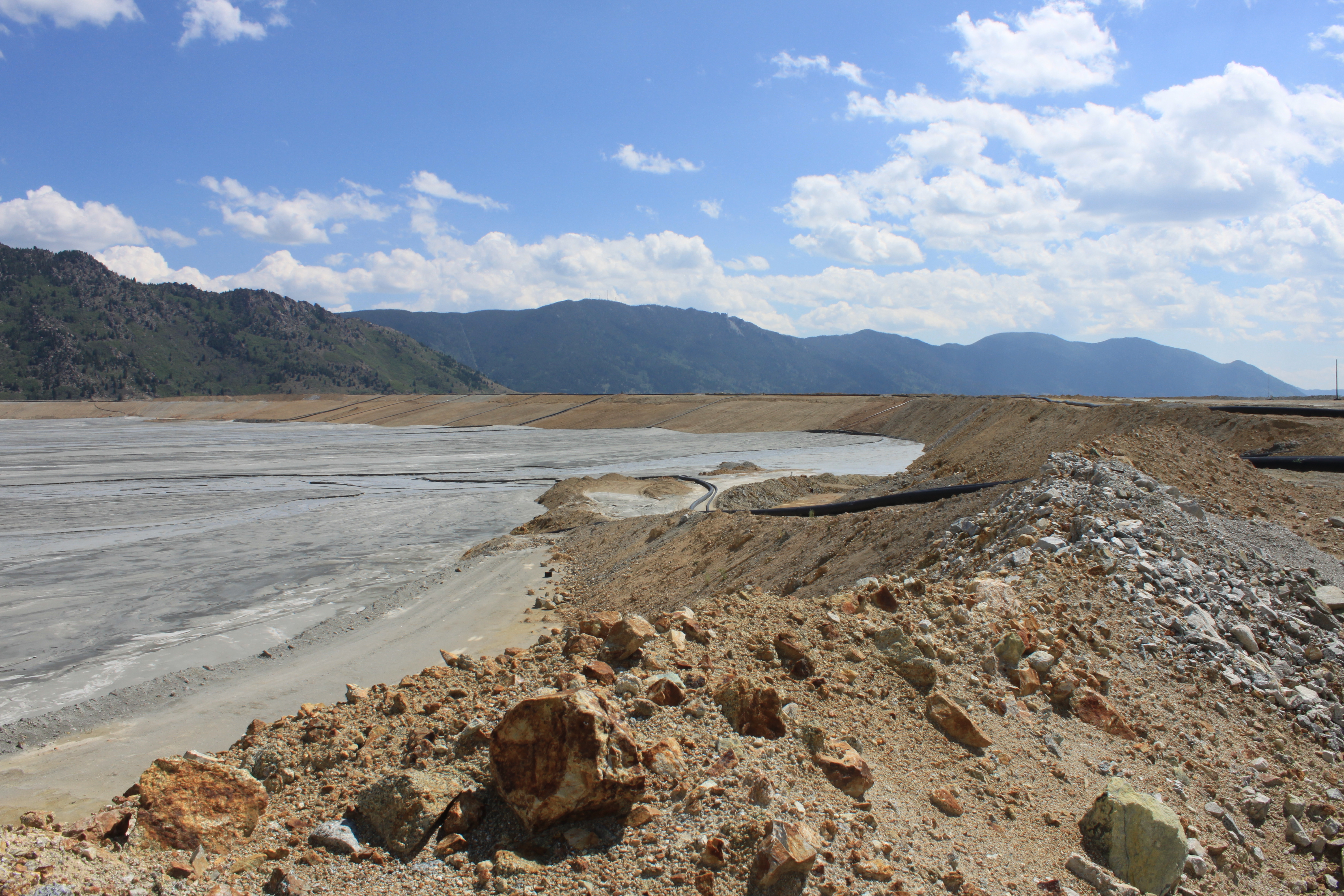 Edge of the Yankee Doodle Tailings Pond in Butte, Montana, where the tailings slurry is piped into the pond.