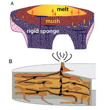 Models of magma storage. Part (A) depicts the standard model of magma storage—a single, large body of crystal-poor melt, surrounded by crystalline mush. Although this is the standard 'mush' model, geophysical studies fail to find evidence of this type of magma storage at many active systems. The diagram in (B) shows the updated model for magma storage in large volcanic systems. This model involves a network of interconnected and/or isolated melt pockets which are tapped sequentially through the course of an eruption.