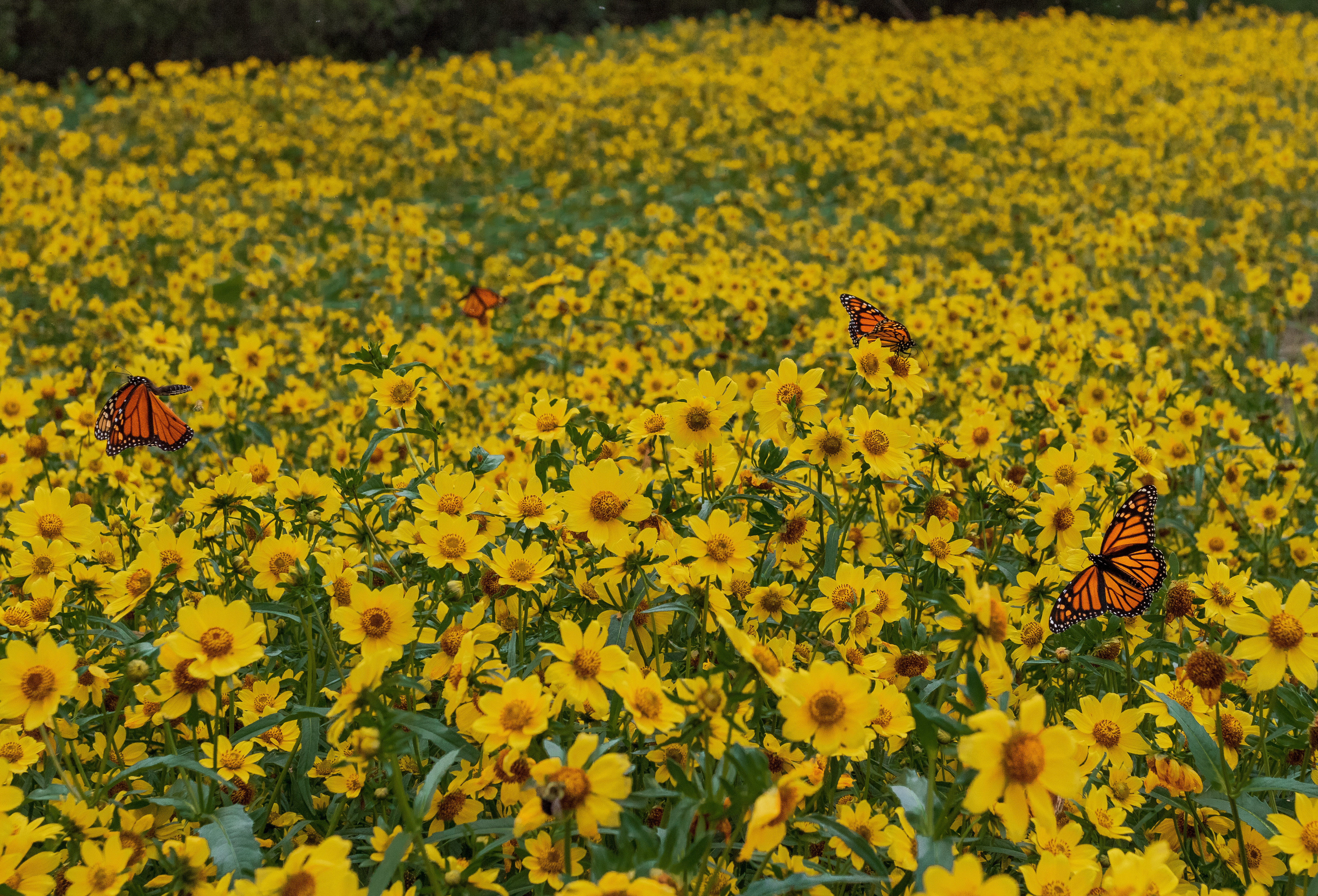 Monarch butterflies in a field of nodding bur-marigold.