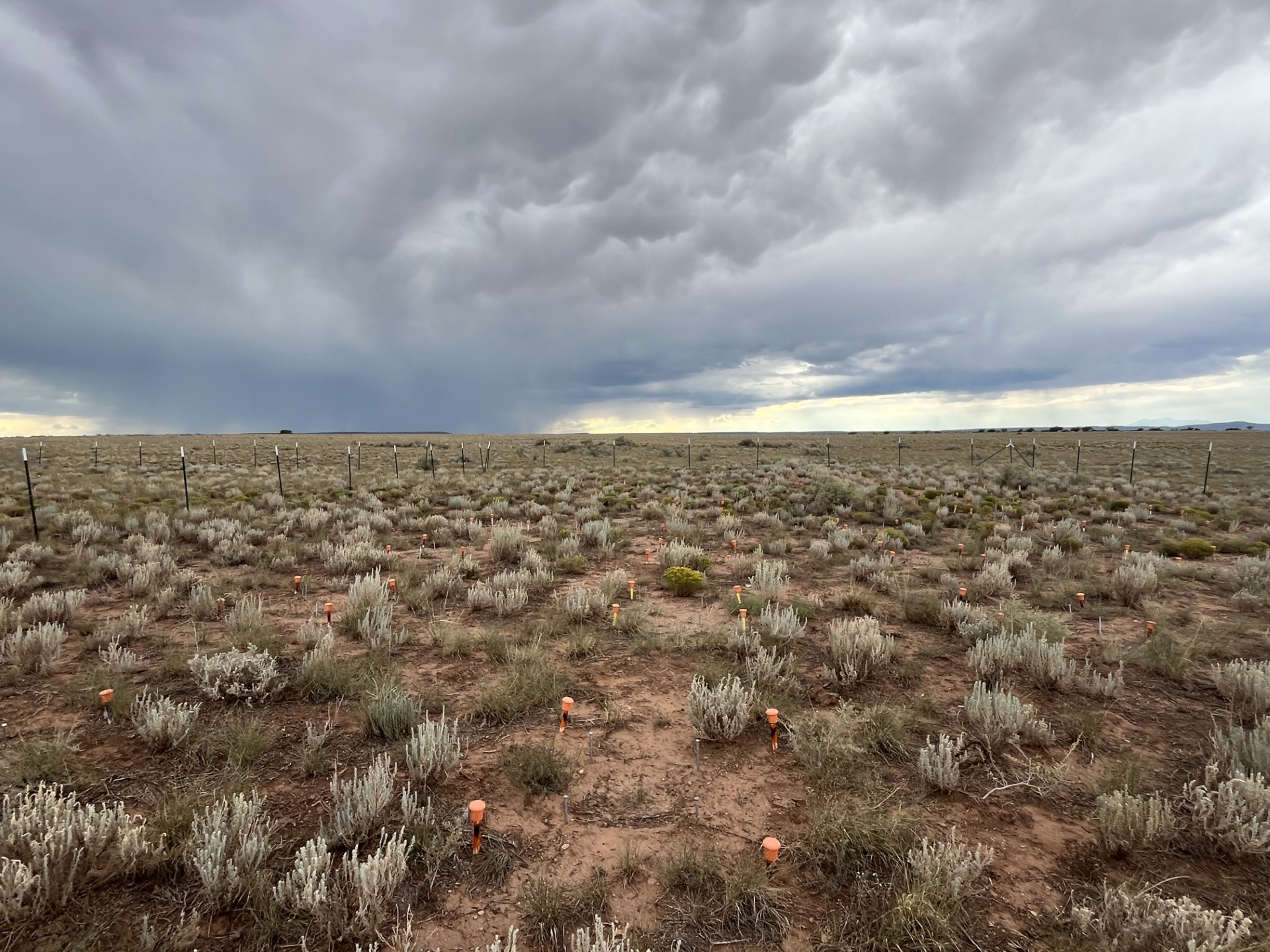 A RestoreNet site in Northern Arizona with late summer monsoon rain clouds in the background. Photo by Laura Shriver.