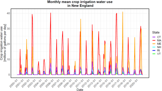 This graph shows the monthly mean (in millions of gallons per day) of water used in crop irrigation from 2000 to 2020 for each state in New England.