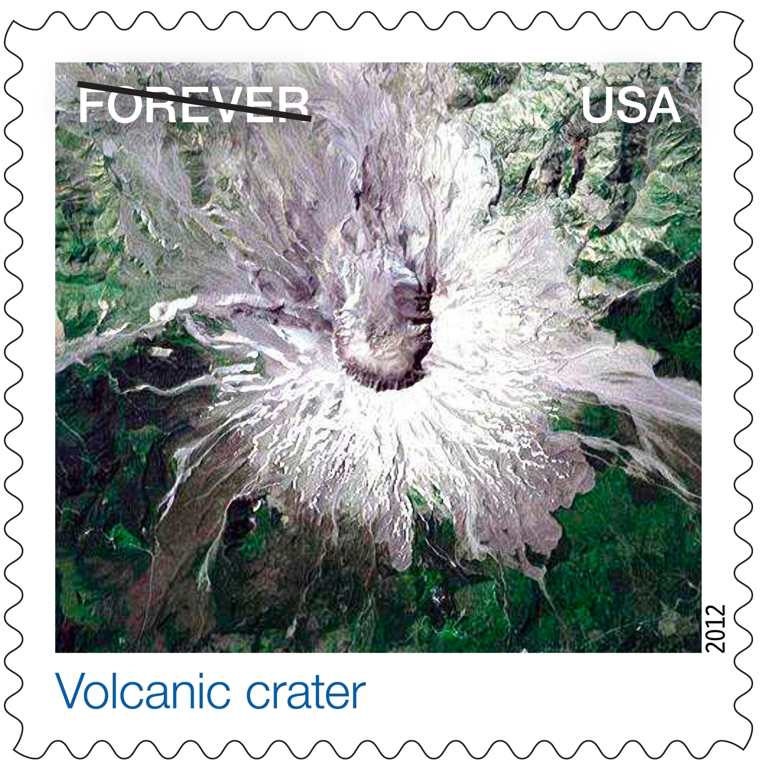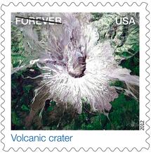 Mount St. Helens and surrounding area recover from the historic May 1980 eruption. Shades of white and gray indicate still-bare slopes that were swept by volcanic flows; light green areas at the top of the photo show regrowth of vegetation in devastated areas; dark green areas at the bottom were unaffected by the eruption.