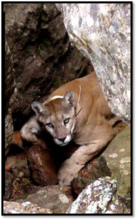 Collared mountain lion between large rocks on Anderson Mesa, Arizona.