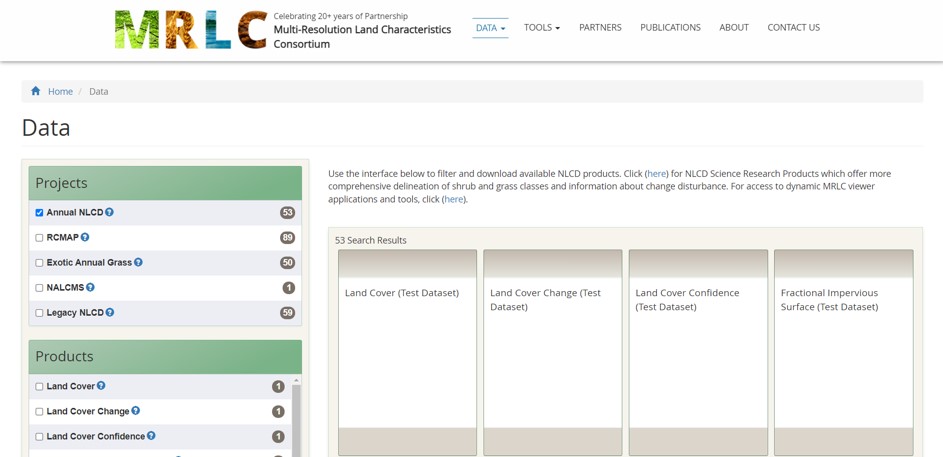 The Multi-Resolution Land Characteristics (MRLC) consortium hosts land cover and land condition data from various sources, including Annual NLCD. Annual NLCD science products are found under the projects tab, and user have the ability to download Annual NLCD CONUS mosaics from 1985-2023.