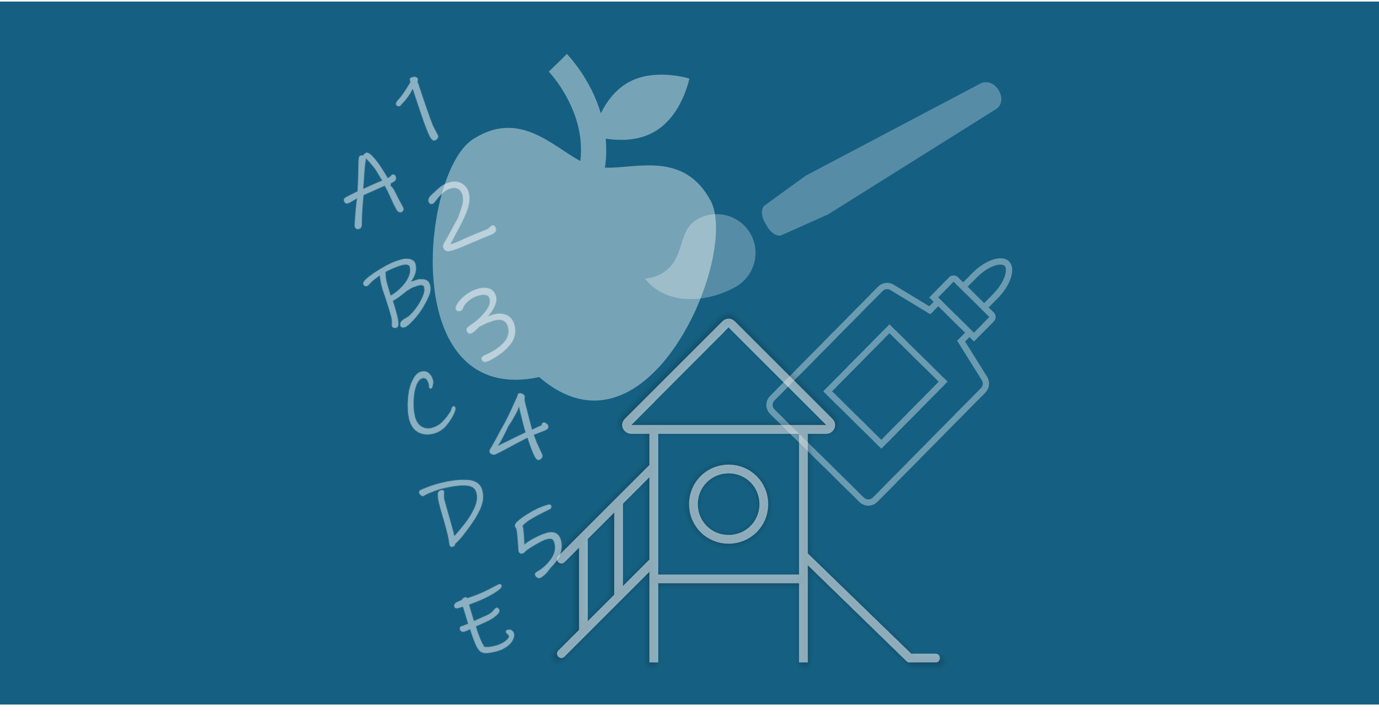Illustration representing elementary school with icons of apple, letters, numbers, playground, glue bottle, and paint brush.