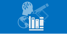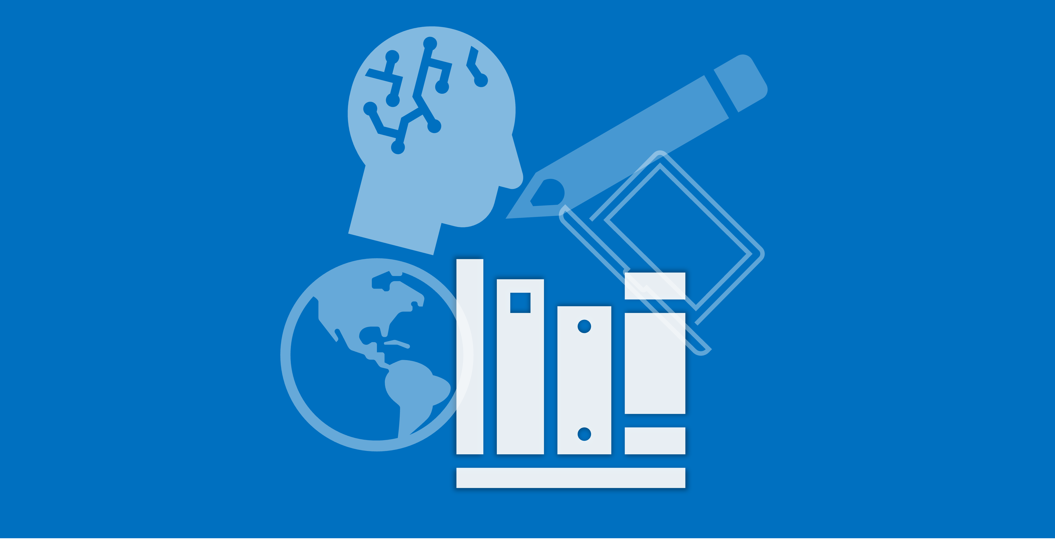 Illustration depicting educational icons of a books, pencil, laptop, Earth, and a human head silhouette.
