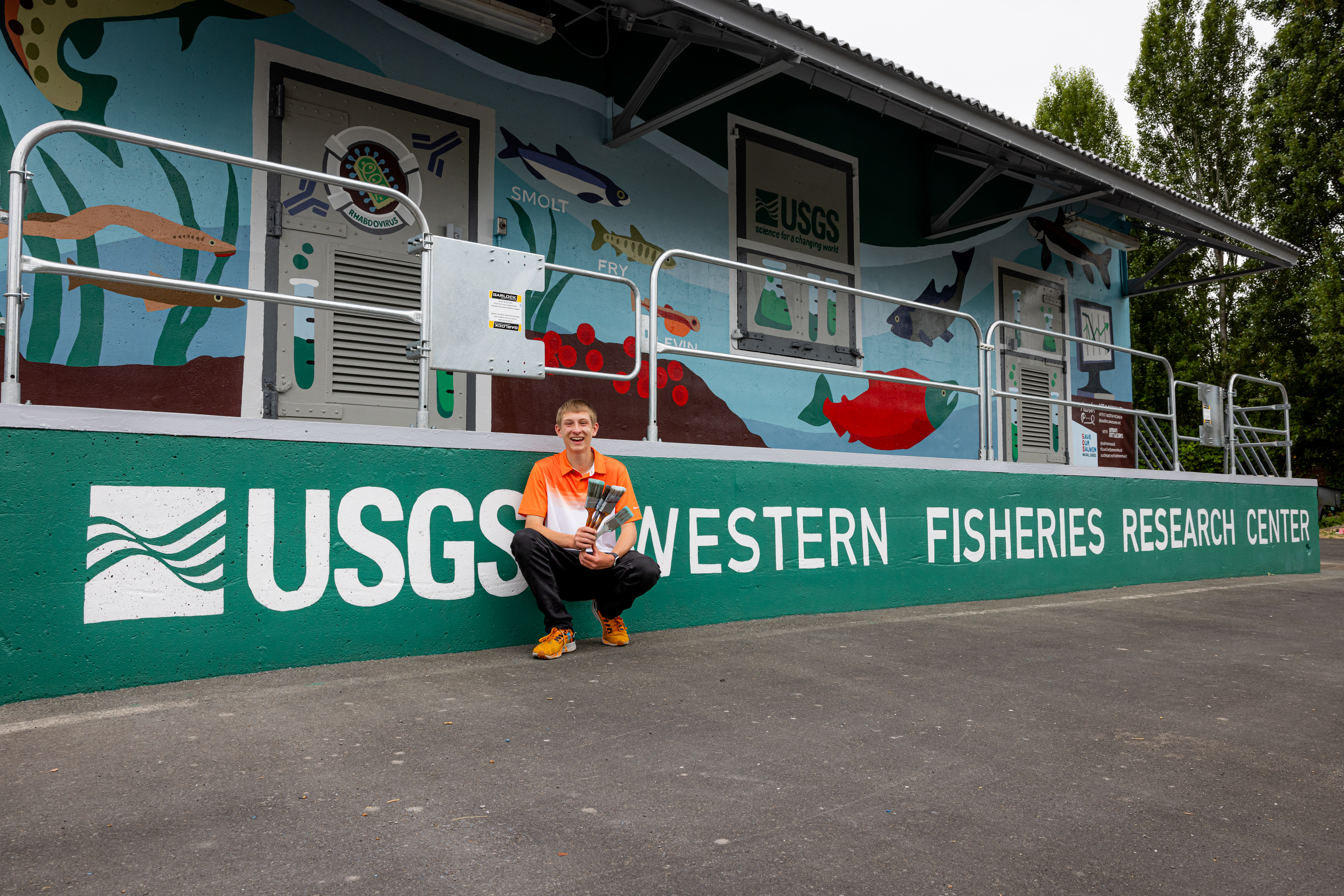 Muralist designer, Austin Picinich in front of finished mural - USGS Western Fisheries Research Center Community Mural Painting Event