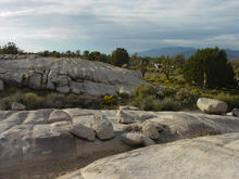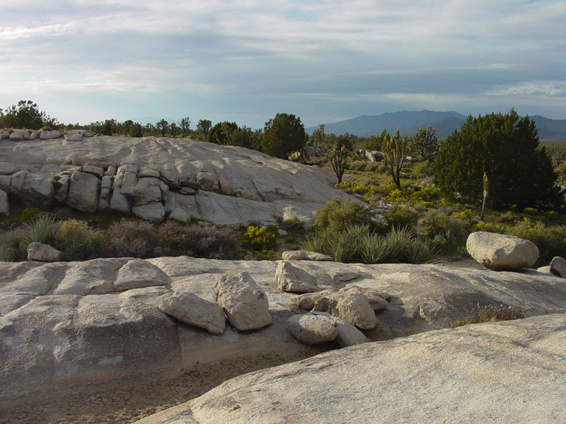 Outcrops of granite with junipers, Joshua trees, and other high desert plants along Cima Road in the Mojave National Preserve. Granitic rocks in the vicinity are part of the Teutonia Batholith, a large intrusive complex of Jurassic and Cretaceous age in the eastern Mojave Desert region (Beckerman and others, 1982).