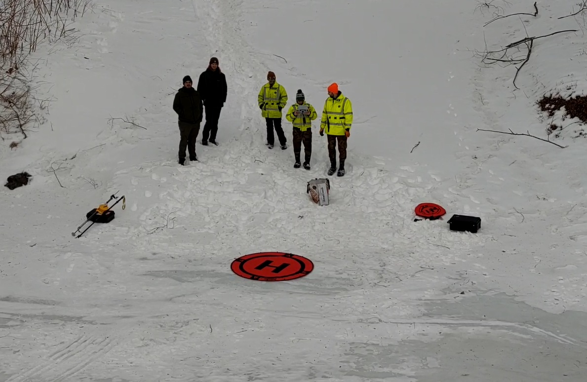 New Jersey Unmanned Aerial Systems (UAS) Team along with two observers bringing their drone back to shore after filming the USGS scientists out on the river making a measurement of flow below the ice at USGS 01438500 Delaware River at Montague, New Jersey