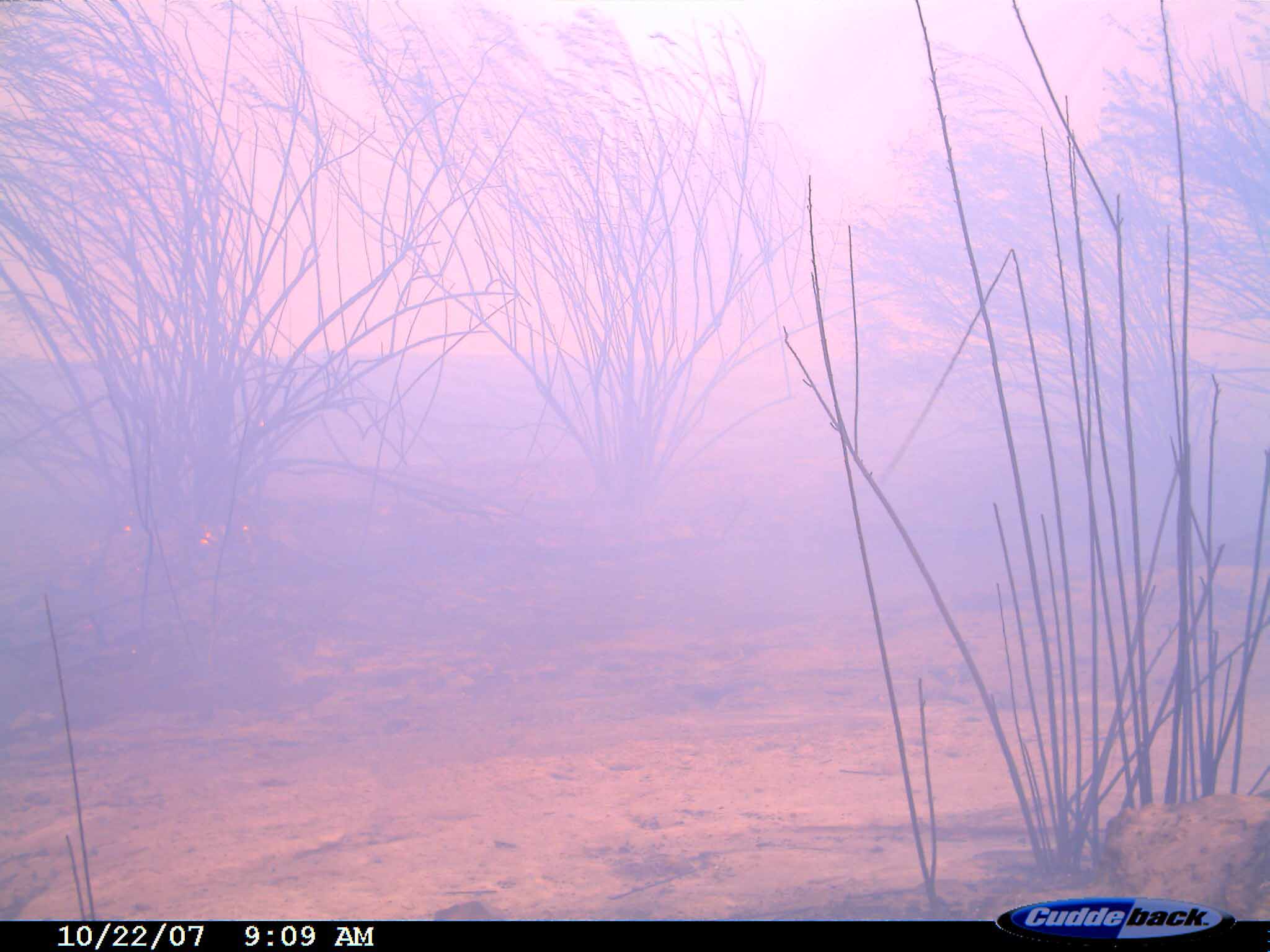 The camera continued to take one photo per minute for 10 minutes after the fire, until this one at 09:10 a.m. PST on Oct. 22, 2007, showing smoke, burnt and smoldering vegetation and windy conditions. The remnants of some field research equipment are lying melted under a nearby tree. Photo credit: USGS.