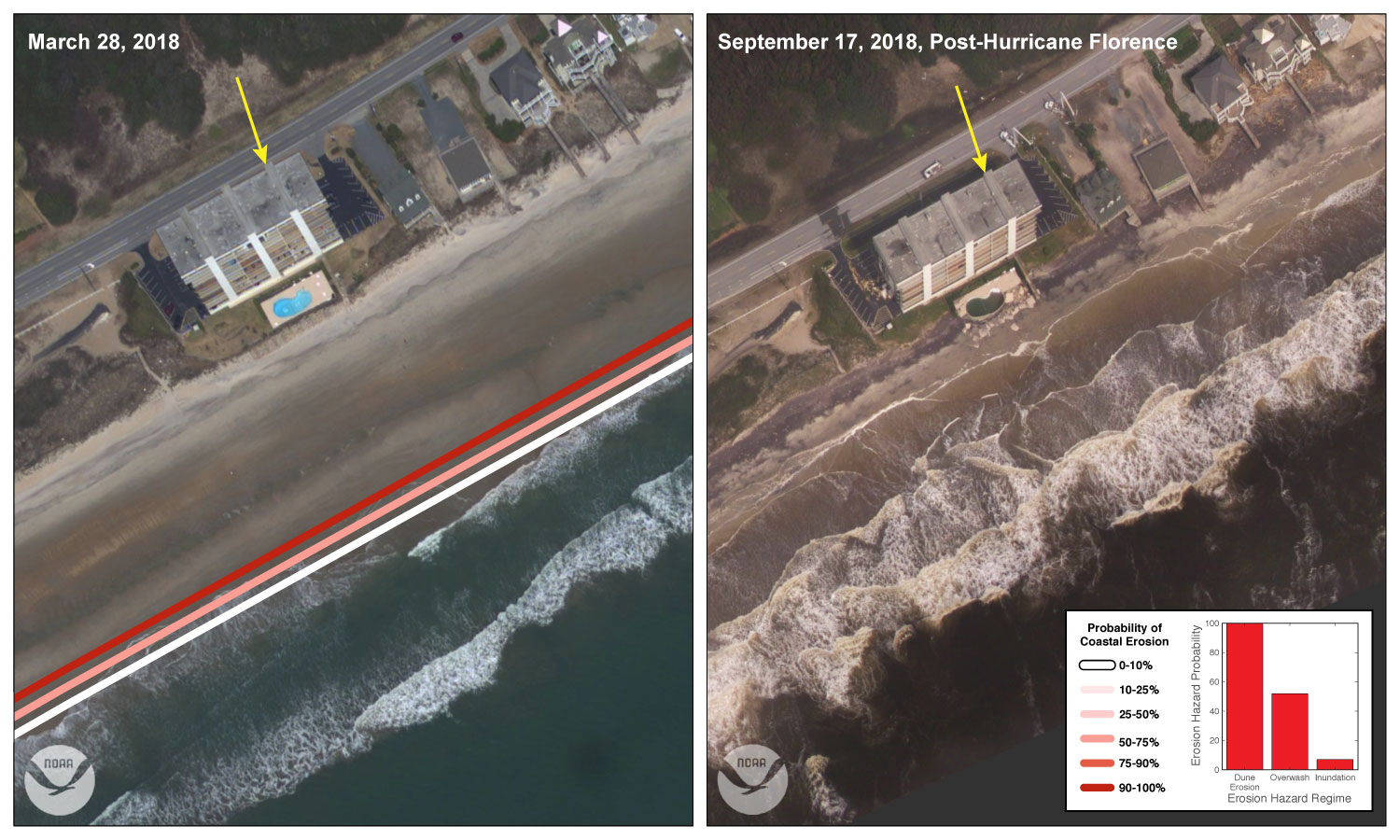 Waves and surge from Hurricane Florence caused dune erosion leading to the collapse of the pool deck in North Topsail Beach. To the south of the pool, the dunes field is narrower, indicating dune erosion, while to the north, the dunes are missing, indicating overwash. Walkways in front of the homes were also damaged by large waves. The probabilities of dune erosion and overwash were 100% and 52% for this location.