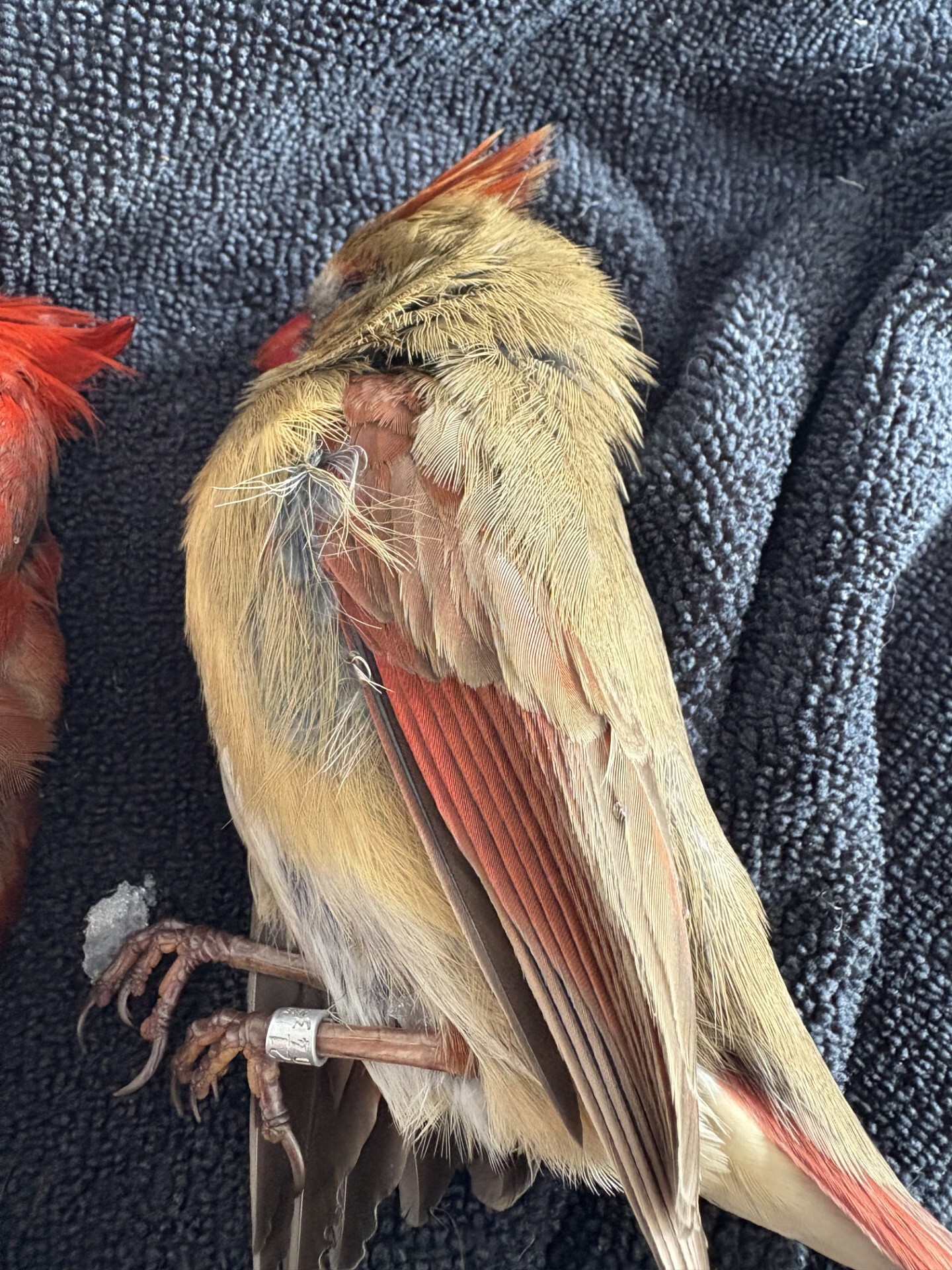 A banded female Northern Cardinal struck a residential window in January 2025 in Illinois.