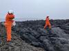 With permission from Hawai‘i Volcanoes National Park, USGS Hawaiian Volcano Observatory scientists landed briefly on the floor of Halema‘uma‘u crater on November 21 to collect lava samples from Kīlauea summit eruption episodes 34, 35, and 36. Geochemical analyses of these samples will provide information on the magma storage conditions below, informing hazard assessment of the ongoing eruption. The geologist on the right is retrieving solid samples from the cooled surface of the episode 34 lava flow (which erupted on October 1), while the other is preparing sample storage bags with notes on the time, location, and type of sample. USGS photo by M. Zoeller.
