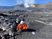 On November 24, a USGS Hawaiian Volcano Observatory helicopter overflight was able to land on the floor of Halema‘uma‘u crater for scientists to collect a sample of cooled lava from a recent overflow of the Kīlauea summit eruptive vents. These overflows—silvery in color when this fresh, as seen on the left of this image—have been erupting intermittently in advance of a likely thirty-seventh lava fountaining episode for the eruption in the coming days. This specific overflow had erupted on November 22 and was no longer emitting much external heat, but the scientists still used water to quench the warm flow interior before transport. Sampling within Halema‘uma‘u, which is done with permission from Hawai‘i Volcanoes National Park, allows for near real-time geochemical analyses, which provide information on the magma plumbing system below. These data inform our understanding of the hazards associated with the ongoing eruption. USGS photo by M. Zoeller.