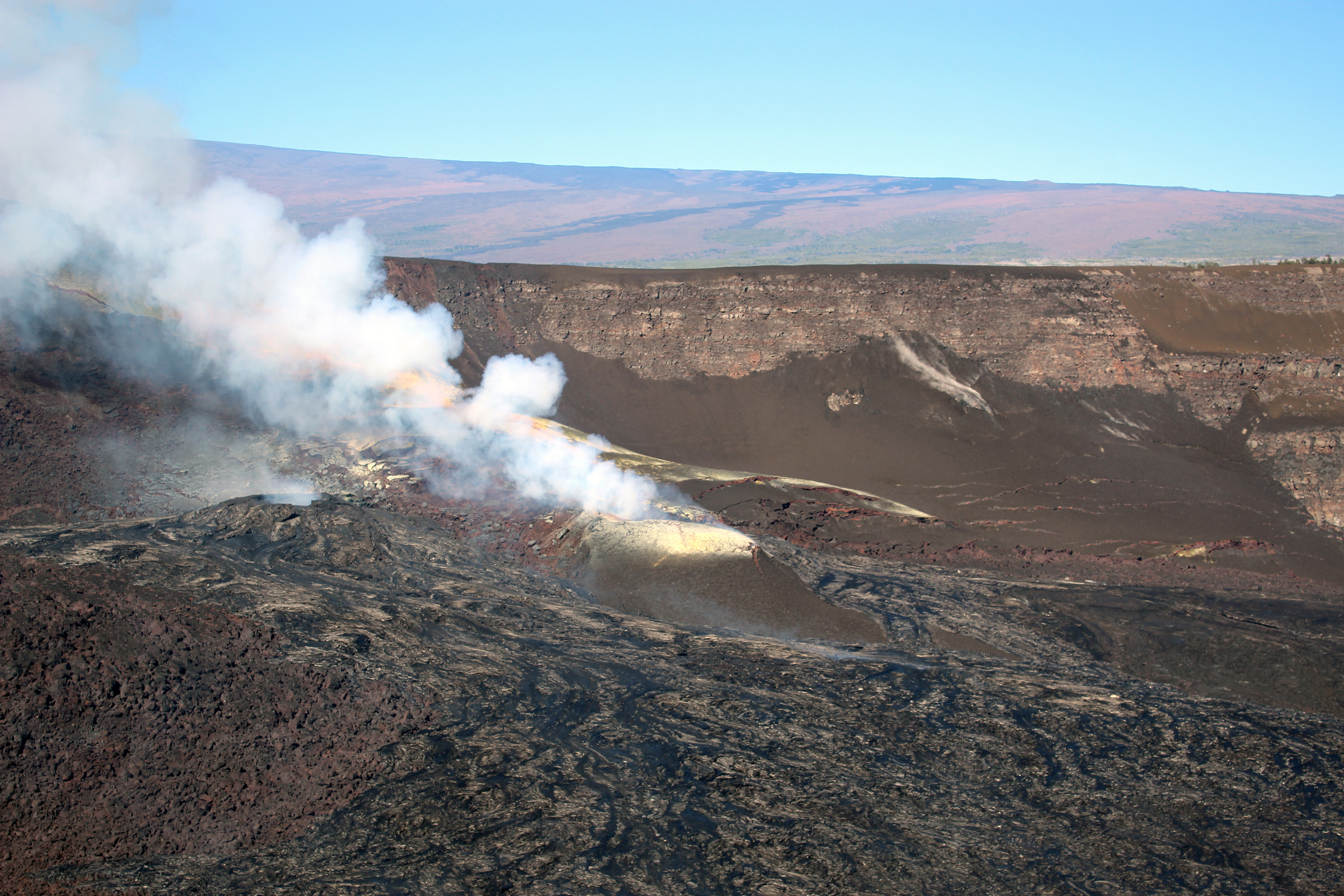 Aerial view within Halema‘uma‘u crater taken during a Kīlauea summit overflight on the morning of November 24, 2025. This view, looking to the northwest, shows the north vent cone (center of image) and south vent cone (center-left) emitting plumes of steam and volcanic gas. Recent activity from both vents, which started again on November 21, produced a series of small Pāhoehoe overflows from the vents (silver flows from center to bottom of photo). The Northeast Rift Zone of Mauna Loa is visible in the background. USGS photo taken by M. Warren.
