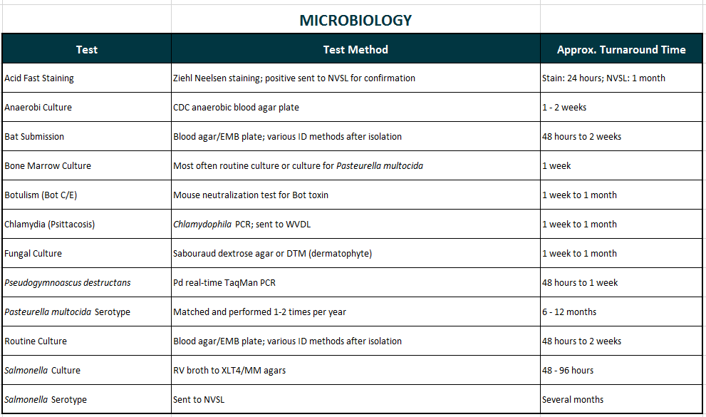 This is a reference guide to the NWHC Diagnostic Laboratories commonly requested microbiology tests. It is not a full list of testing capabilities of the laboratories.