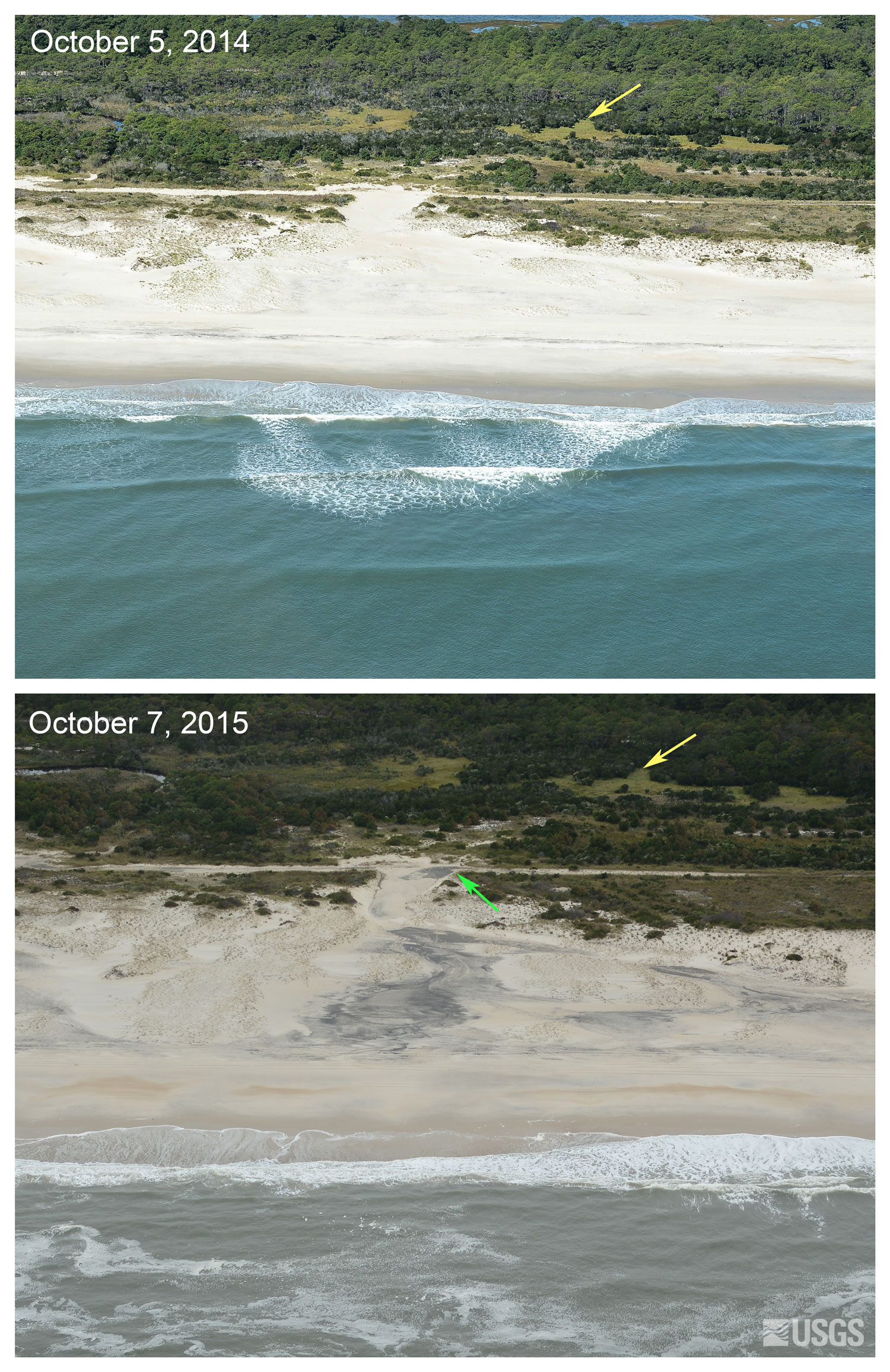 Oblique aerial photographs of Assateague Island National Seashore, Maryland. View looking west along Assateague Island. Overwash occurred at the cut in the dunes where a dark sand deposit shows evidence of landward transport (green arrow). The yellow arrow in each image points to the same feature. [larger version]