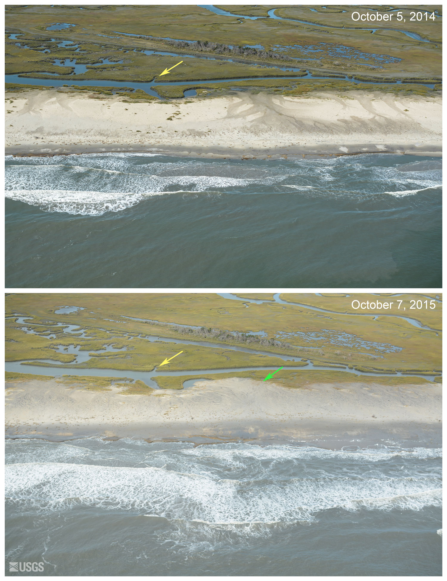 Oblique aerial photographs of Cedar Island, Virginia. View looking west along Virginia's barrier-island shore. Very low dunes at this location allowed overwash to transport sand inland over the marsh platform (green arrow). The yellow arrow in each image points to the same feature.