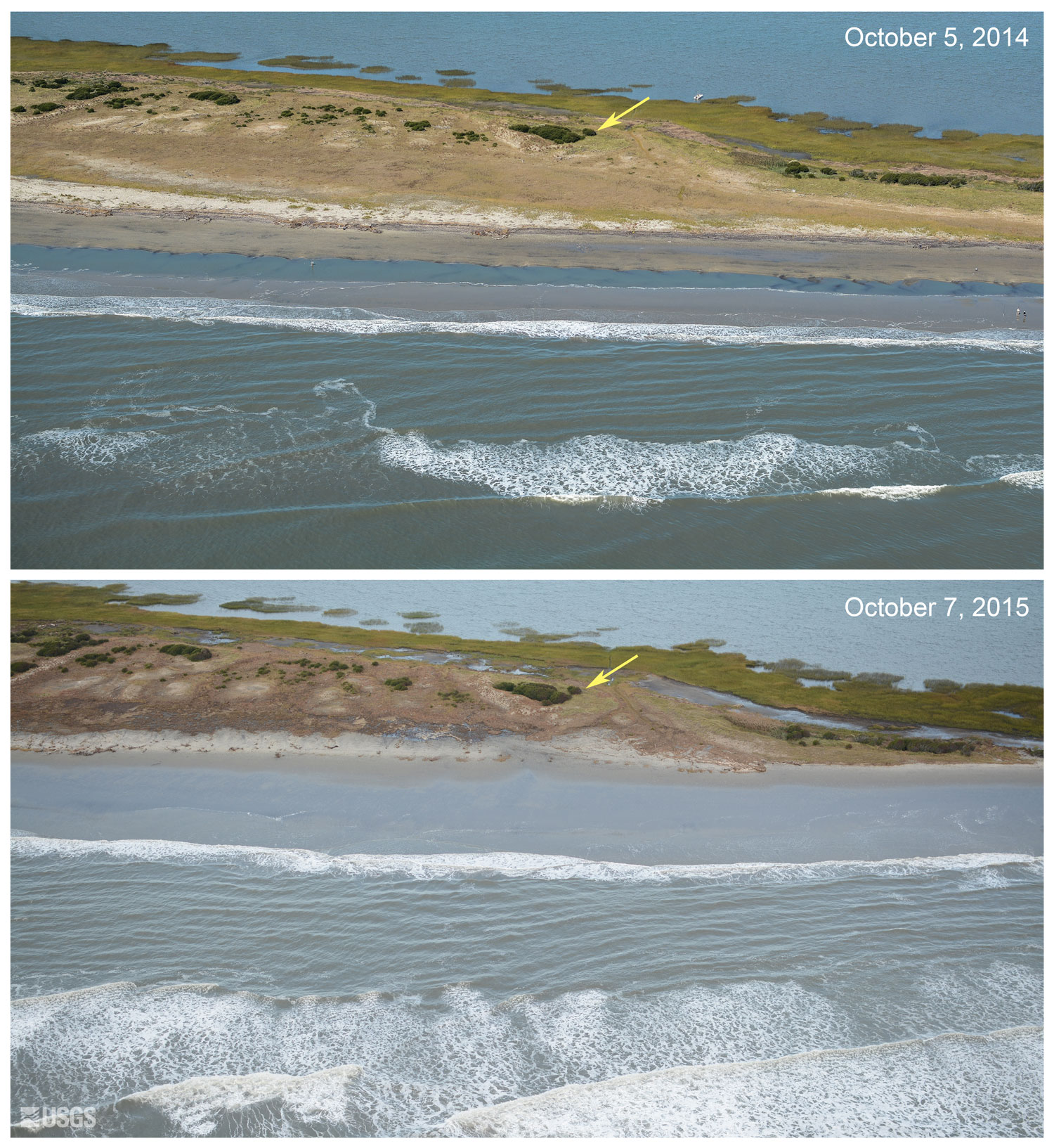 Oblique aerial photographs of Cobb Island, Virginia. View looking west along Virginia's barrier-island shore. Waves and surge from Hurricane Joaquin reached the base of the dune and caused erosion of the dune face, resulting in a steep dune scarp. The yellow arrow in each image points to the same feature.