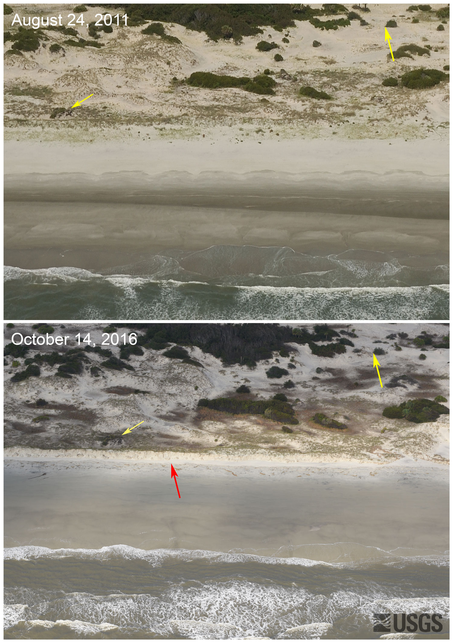 Location 1: Oblique aerial photographs at Cumberland Island, Georgia. Oblique aerial photographs collected before (top) and after (bottom) Hurricane Matthew. Storm waves eroded the dune face causing a steep scarp (red arrow). The yellow and red arrows in each image point to the same features in both photos.