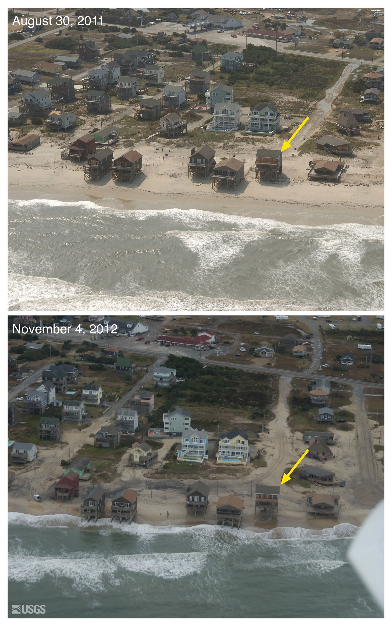 Oblique aerial photographs of Rodanthe, North Carolina. View looking west along the North Carolina shore. Beach erosion moved the shoreline landward to reach houses built on the beach. Sand on the roads behind the beach indicates landward transport of sand by overwash. The yellow arrow in each image points to the same feature.