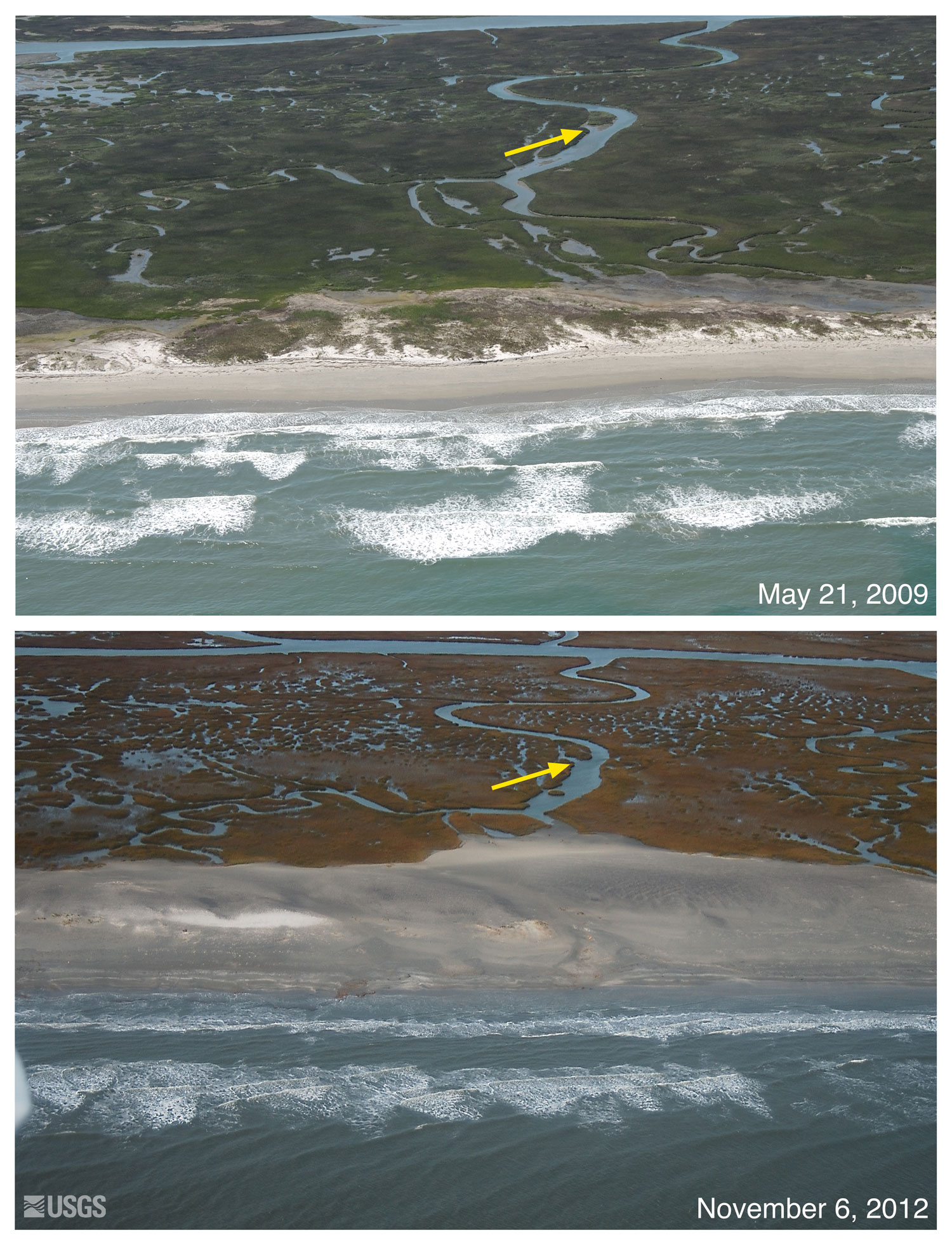 Oblique aerial photographs of Smith Island, Virginia. View looking west along Virginia's barrier-island shore. Moderately high dunes here were eroded and overwash transported sand inland. Marsh and marsh channels were buried. The yellow arrow in each image points to the same feature.