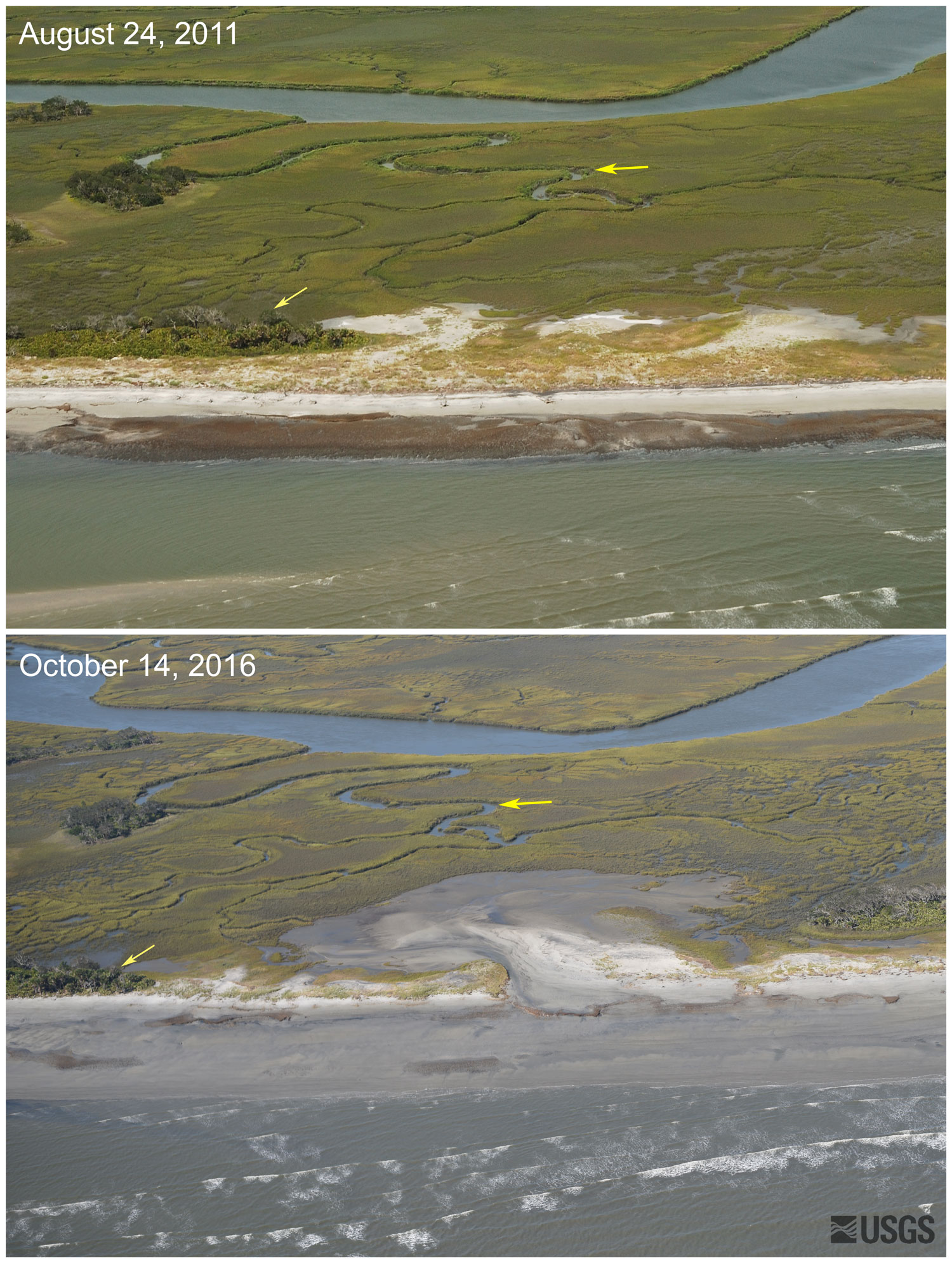 Location 4: Oblique aerial photographs at St. Catherines Island, Georgia. Oblique aerial photographs collected before (top) and after (bottom) Hurricane Matthew. Storm waves and currents eroded the sand dunes, allowing sand to be transported landward into the marsh. The yellow arrows in each image points to the same features in both photos.
