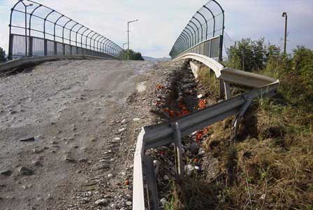 The fault trends through a highway overpass (which did not fail), causing the guardrail to be offset ~2.8 m.