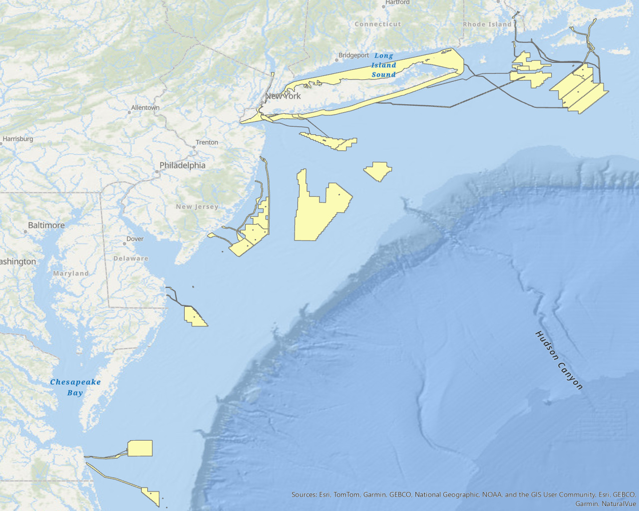 Offshore wind lease polygons retrieved from the 'Offshore Wind Lease Outlines' feature class available on Marine Cadastre.