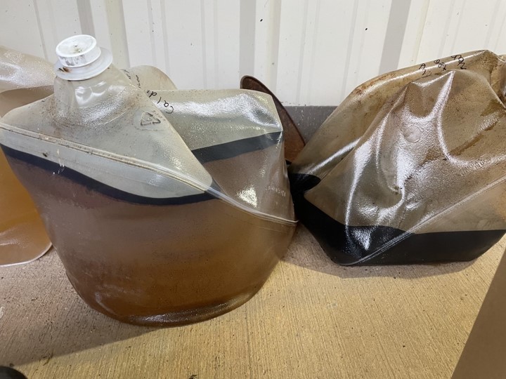 Oily produced water collected from an oil well for U.S. Geological Survey laboratory analysis.