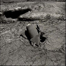 This "pointer bomb," dropped on the 1935 Mauna Loa Humu`ula lava flow, was found and photographed in 1939 during Thomas Jaggar's post-eruption inspection of the flow, and again in 1977 by now-retired USGS Hawaiian Volcano Observatory geologist Jack Lockwood. This same bomb was recently rediscovered and featured in Hawai‘i media reports. USGS photo by J. Lockwood, 1977.