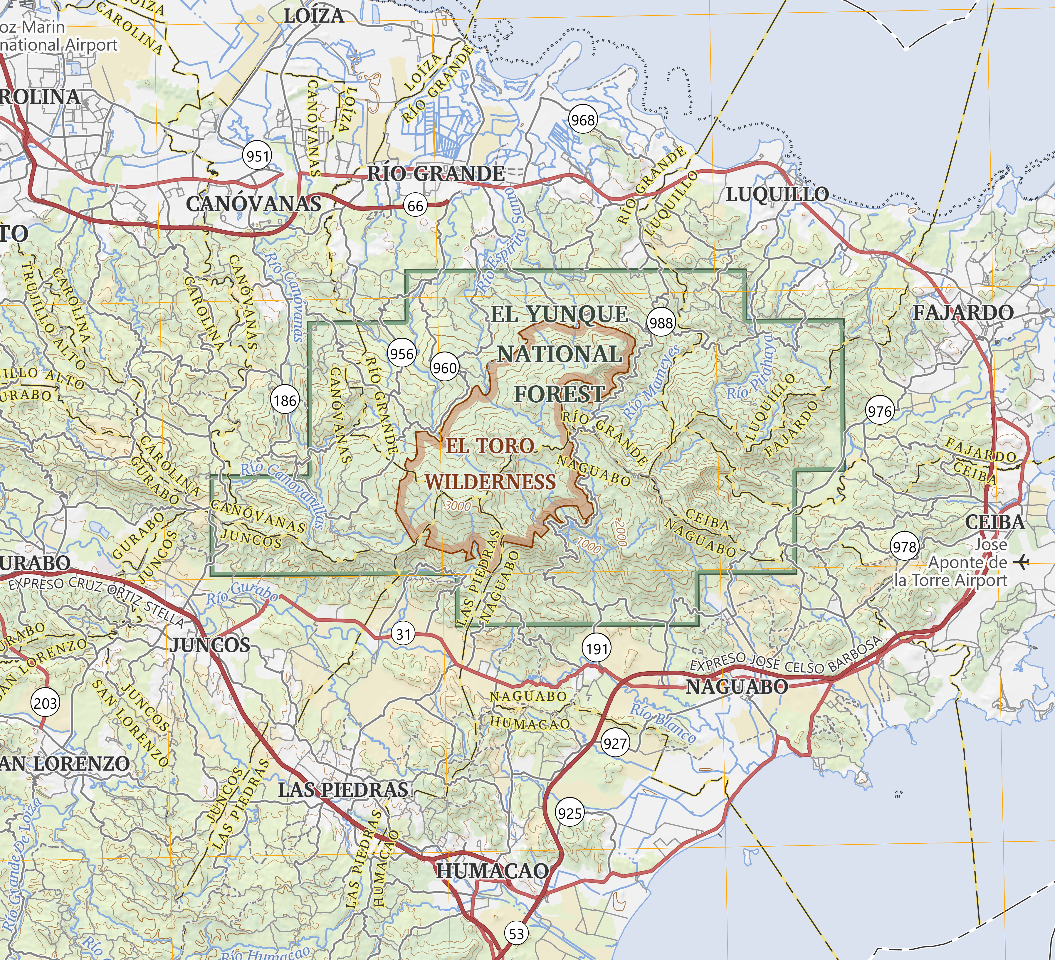 OnDemand Topo image of Puerto Rico displaying boundary themes exported from the topoBuilder application at the 250K scale.