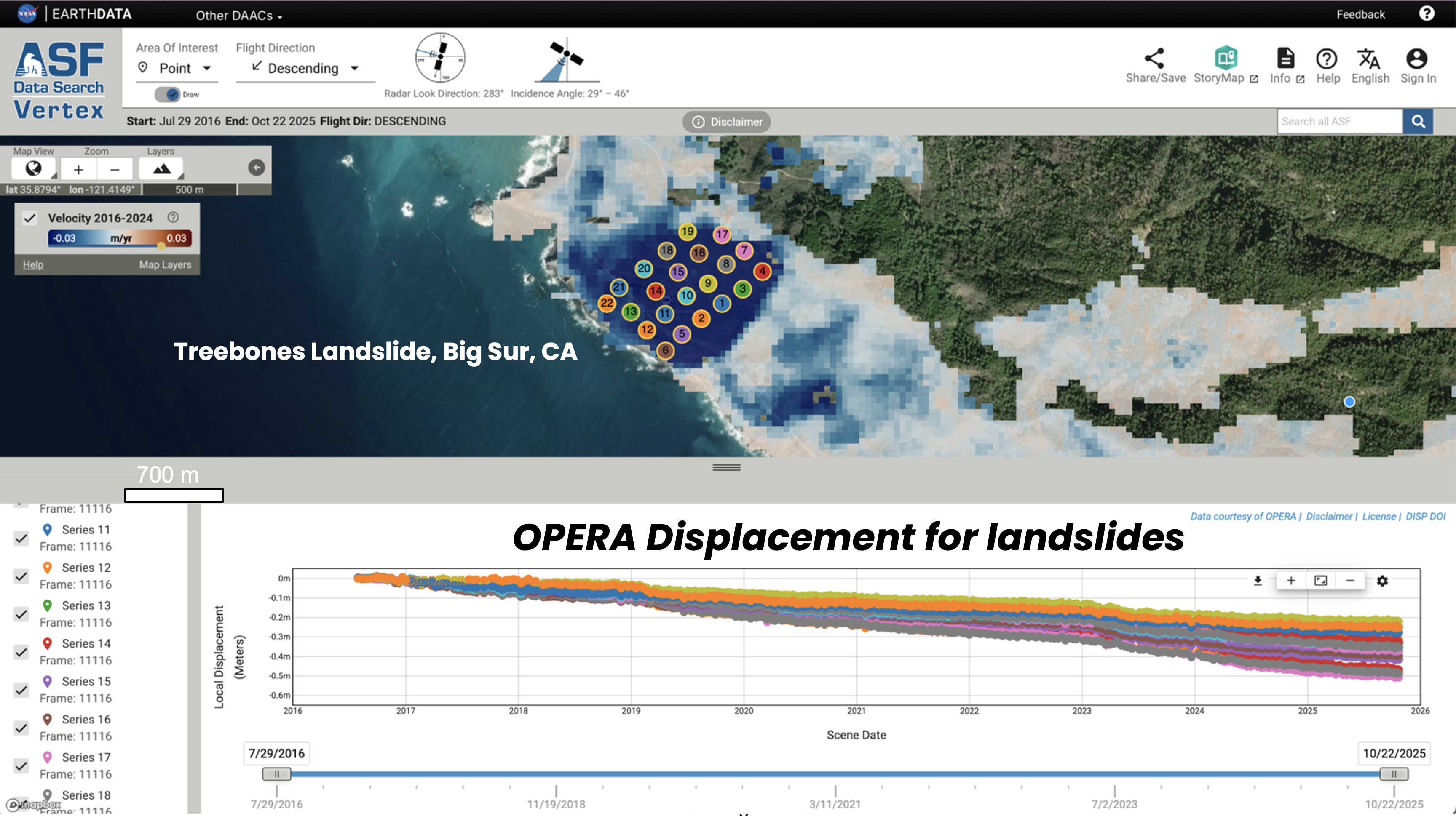 OPERA Surface Displacement from Sentinel-1 (DISP-S1) viewed on the ASF Displacement portal showing slow-moving landslide motion in Big Sur, California.