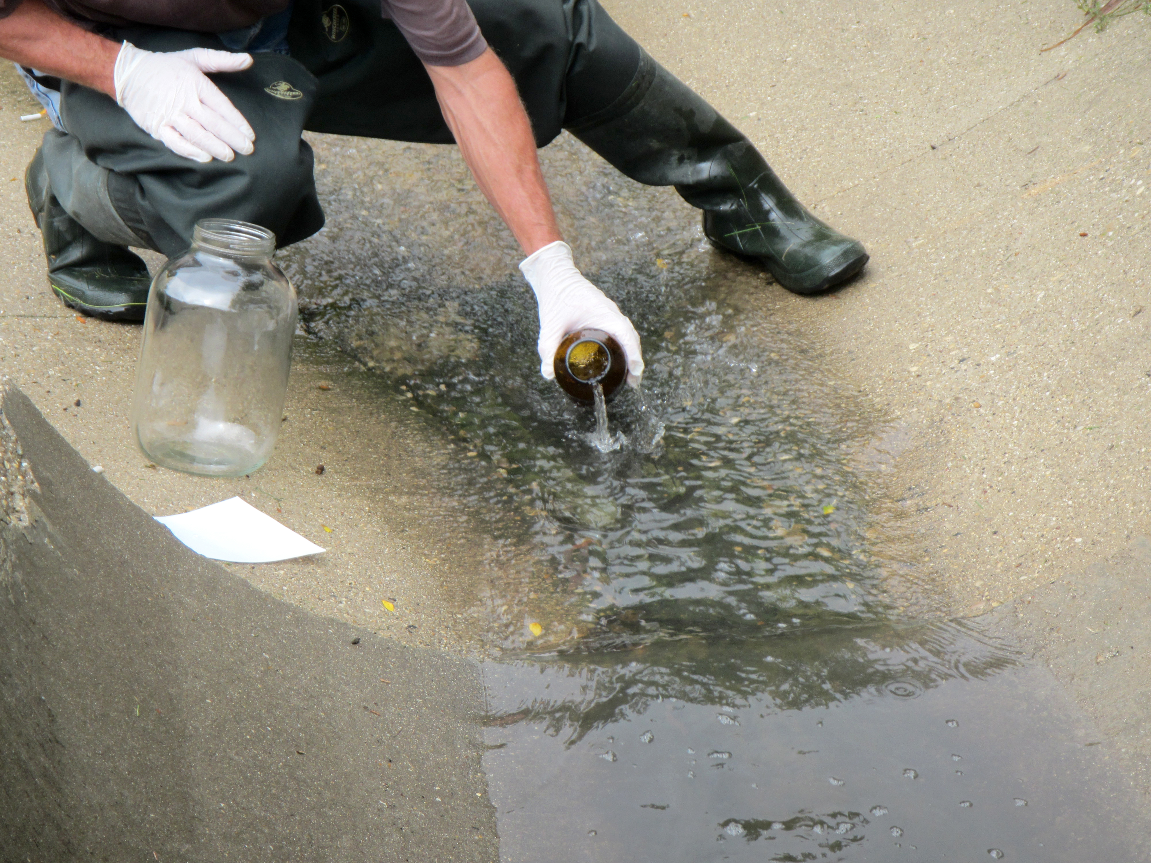 Photo of a USGS scientist taking an manual water-quality sample as part of the optical sensor sewage detection study. Manual sampling is done at remote sites when local roadways do not allow for access by the mobile water-quality sampling station.