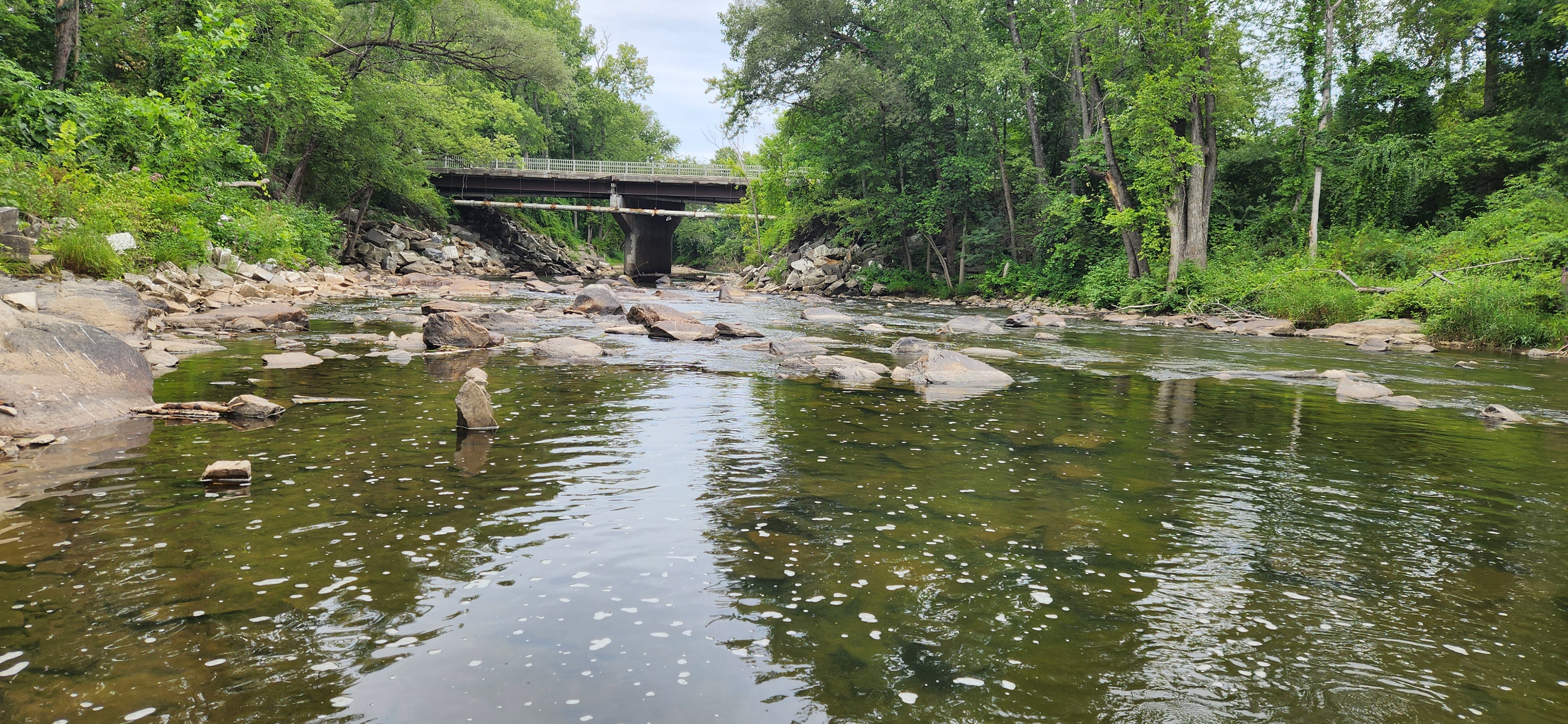 A view of low flows and exposed rocks in Otter Creek at Center Rutland, Vermont, near monitoring station 04282000. This photo was taken during a drought in the summer of 2025.