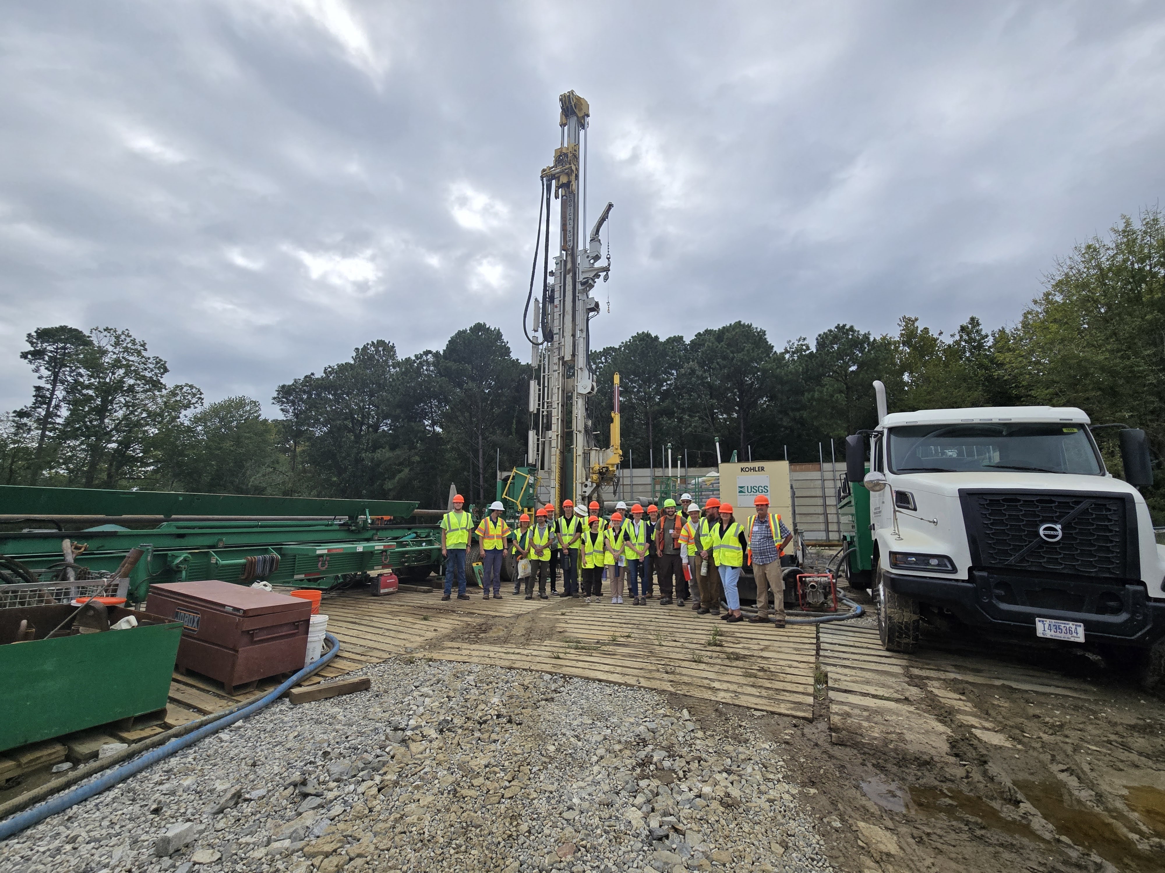 A group of partners, scientists, and academics visit the USGS James River Extensometer drill site as a part of a community outreach event in Newport News, Virginia.