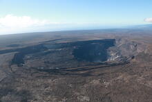 On December 18, Hawaiian Volcano Observatory scientists conducted an overflight of Kīlauea's summit. In this view, looking southwest, large cracks are visible on Kīlauea's caldera floor above and adjacent to the portion of Kīlauea's caldera floor that down-dropped during the summit collapse-events of 2018. During the flight, the Kīlauea summit area was filmed with both thermal and visual cameras. When compared to previously collected imagery, the images collected on December 18 will provide information on changes at Kīlauea's summit. USGS photo by K. Mulliken.