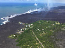 This photo, taken from a helicopter overflight at 1PM HST, shows the remains of the Kapoho Beach Lots subdivision and the fissure 8 flow front. The northern flow margin in this area was unchanged from morning flight and appears to have stopped advancing.