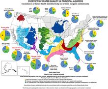 Overview of water quality in Principal Aquifers. The colored pie charts indicate the proportion of the area studied that contained a constituent in untreated groundwater at a concentration that exceeds a human-health benchmark for drinking water.
