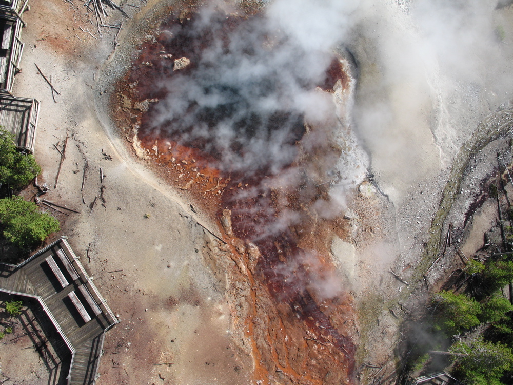 In September 2005, USGS/YVO Postdoctoral Fellow Brita Graham Wall used a radio-controlled camera, attached to a helium-filled balloon to take photos from the sky above the Norris Geyser Basin. Brita used these photos to gain insight into the distribution of cracks and fractures that feed the hot springs at Norris.