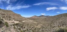 Panoramic view from Franklin Mountains in El Paso, Texas, looking northward to the Organ Mountains of New Mexico, all atop the Woodford Shale, visible as dark gray material on left.