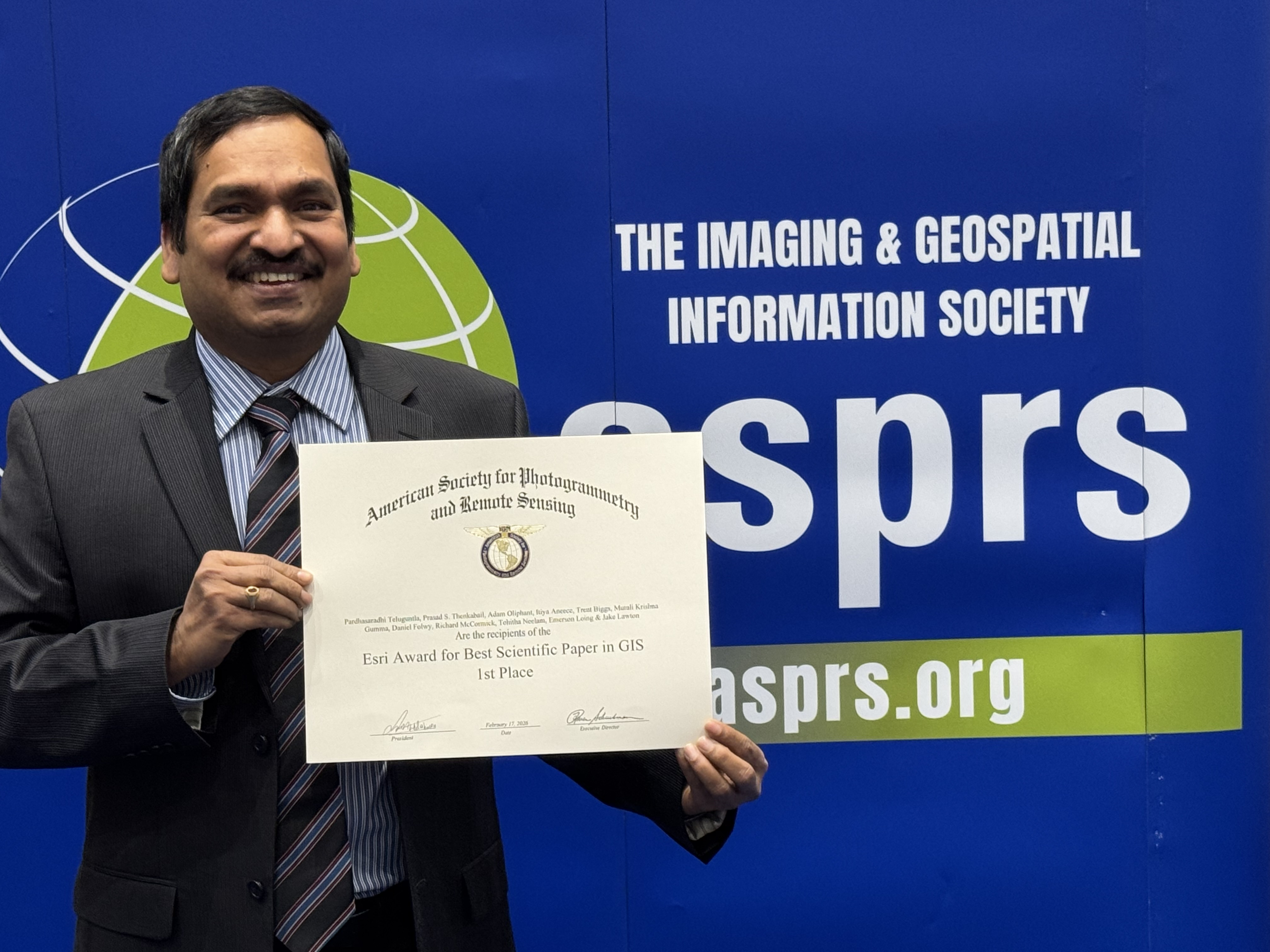 Pardhasaradhi Teluguntla presenting certificate of ESRI's Award for Best Scientific Paper in GIS -1st Place. Picture taken at ASPRS Awards Ceremony held in Denver, CO on 02/17/2026.