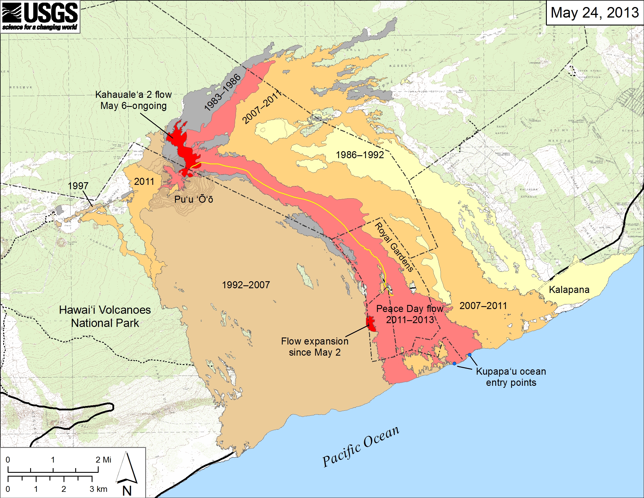 Small-scale map showing the active Peace Day flow, carrying lava to the ocean, and the active Kahauale‘a 2 flow north of Pu‘u ‘Ō‘ō, as of May 24, 2013. The Kahauale‘a 2 flow started on May 6 and continues to spread slowly at the base of Pu‘u ‘Ō‘ō Cone. Southeast of Pu‘u ‘Ō‘ō, breakouts near the base of the pali crept beyond the western edge of the Peace Day flow, widening that flow field and crossing into the National Park. The eastern Peace Day flow margin may have also changed near the coastline and mid-way up the pali, where small breakouts have persisted for weeks, but these areas were not mapped recently. Older lava flows are labeled with the years in which they were active. Episodes 1-48b (1983-1986) are shown in gray; episodes 48c-49 (1986-1992) are pale yellow; episodes 50-55 (1992-2007) are tan; and episodes 58-60 (2007-2011) are pale orange. The Peace Day lava tube is shown by the yellow line. The Peace Day tube where it crosses the coastal plain is not obvious and has not been mapped. The contour interval for topographic lines shown on Pu‘u ‘Ō‘ō is 5 m.